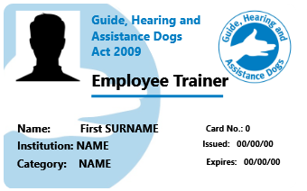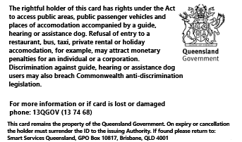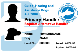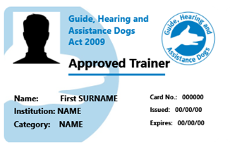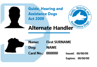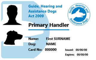 For the Handler of a guide, hearing or assistance dog – a Handler's identity card issued by an Approved Training Organisation (e.g. the Queensland Department of Communities, Child Safety and Disability Services (Queensland Department of Communities).
